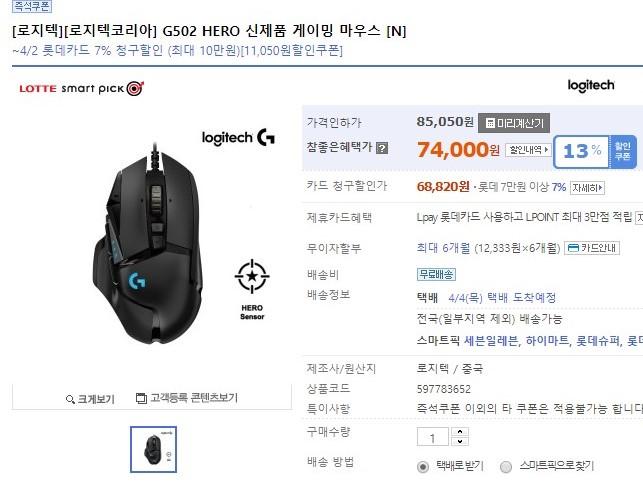 [롯데닷컴] 로지텍 G502 HERO 게이밍 마우스 (74,000/무료배송)