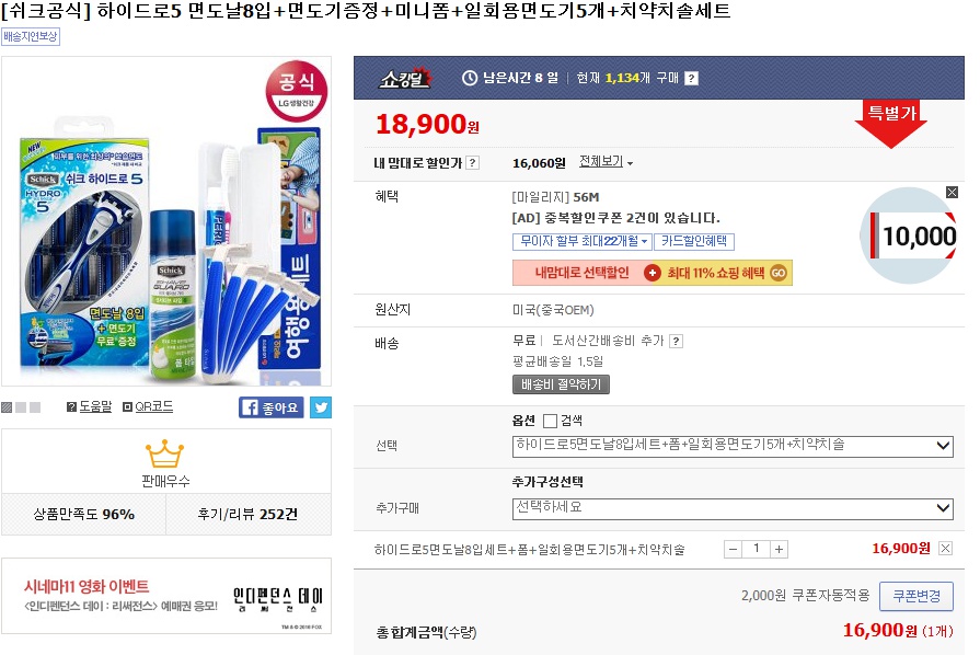 [11번가] (끌올) 쉬크 하이드로5 면도날8입+면도기증정+미니폼+일회용면도기5개+치약치솔세트 (18900/무료) > 국내핫딜