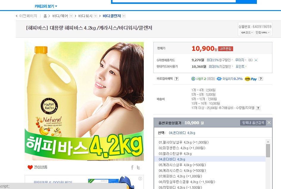 [G마켓]대용량 바디워시(온더바디 4.2kg 기준)(10,900/2500) > 국내핫딜