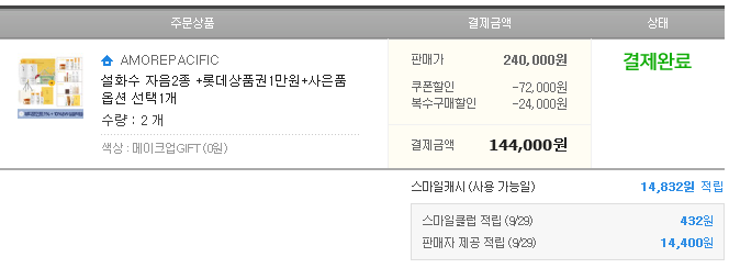 : 사진처럼 스마일캐시 14,832 적립됩니다. 그리고 실결제금액도 또 떨어지죠.
