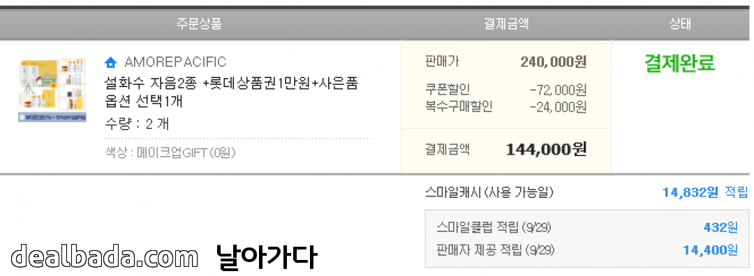 [G마켓] 설화수 자음2종 +롯데상품권1만원 (120,000원/무료)