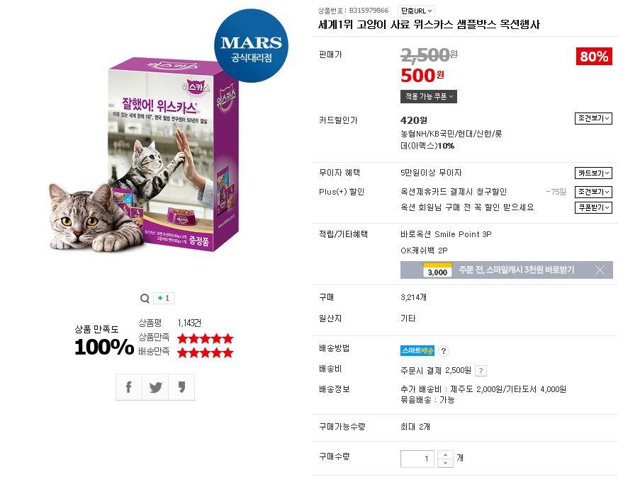 [옥션] 고양이 사료 위스카스 샘플링 팩 (1000/0) > 국내핫딜