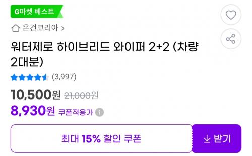 [G마켓] 워터제로 하이브리드 와이퍼 2+2 (차량 2대분) (8,930원/무료)