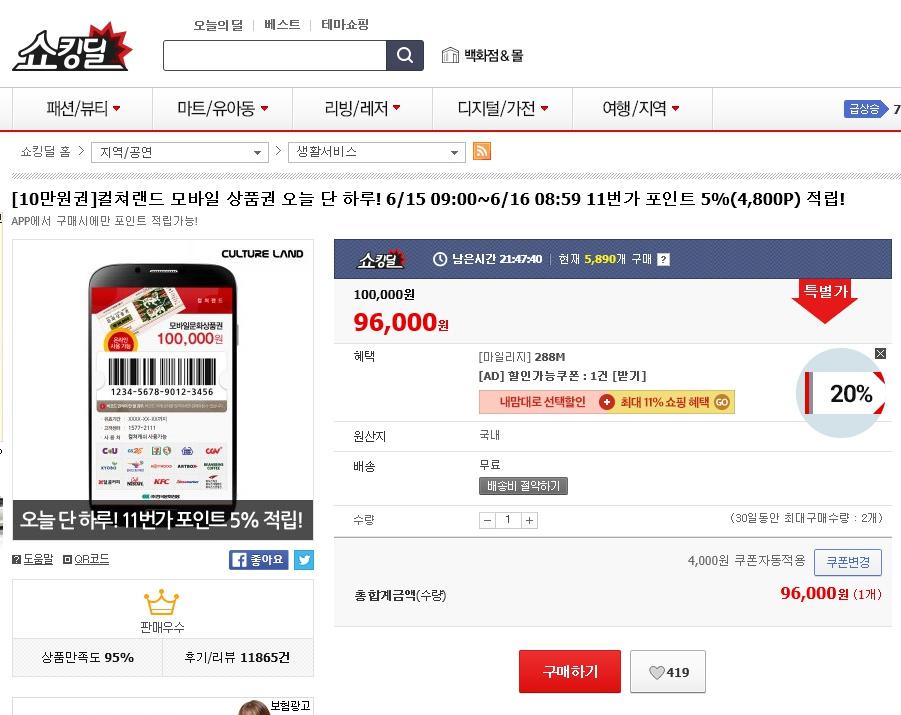 (끌올)[11번가]컬쳐랜드 모바일 상품권 10만원 - 앱 구매 시 11번가 포인트 5%(4,800P) 적립 (96,000/무료) > 국내핫딜