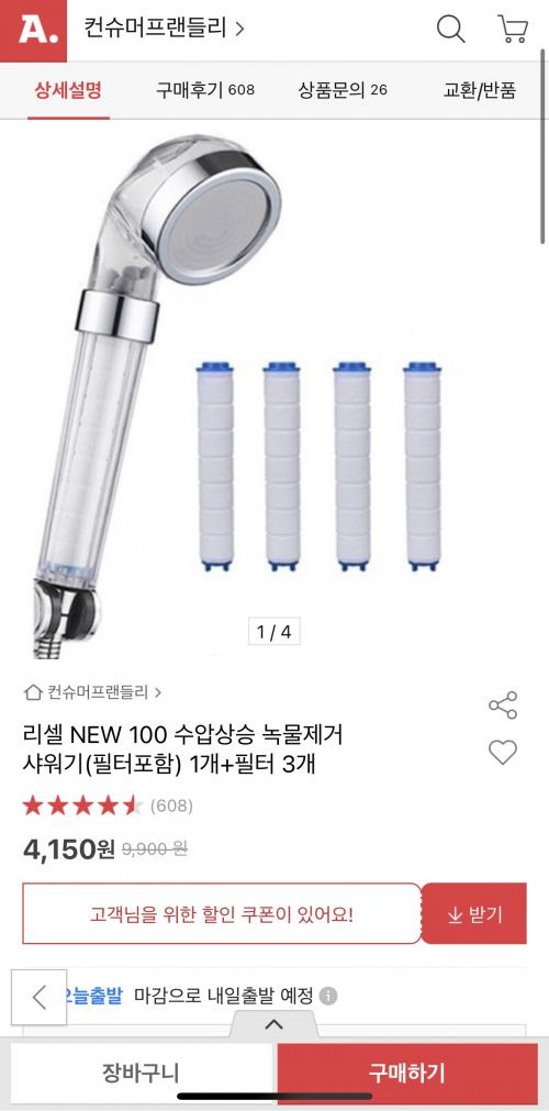 [옥션] 리셀 100 수압상승 녹물제거 샤워기 + 필터 3개 (4,150원 / 무료배송) > 국내핫딜