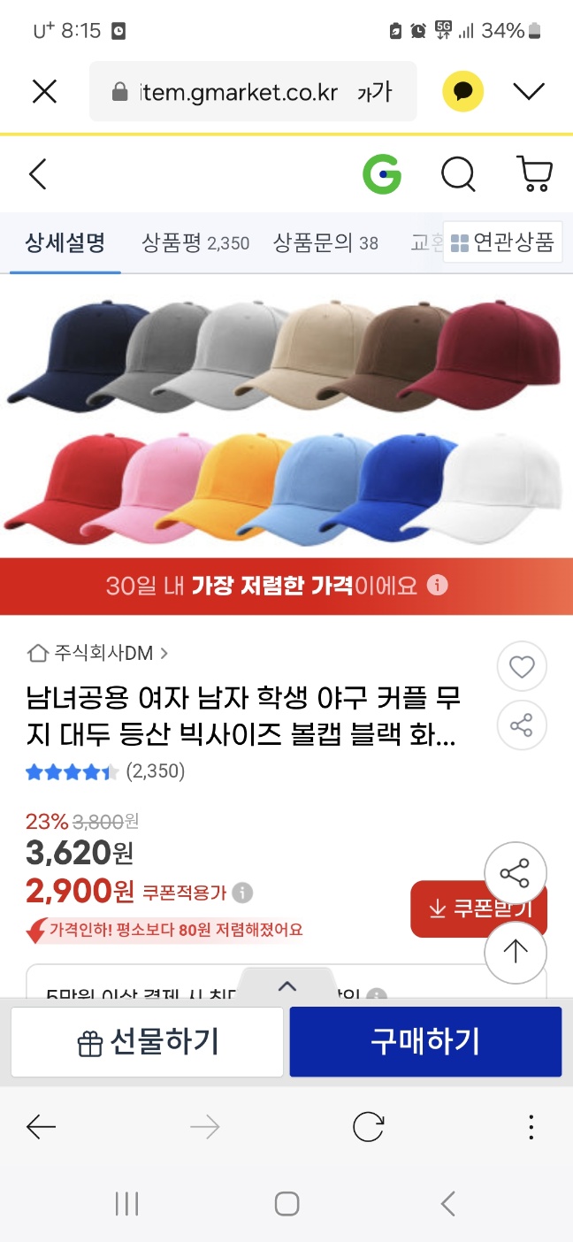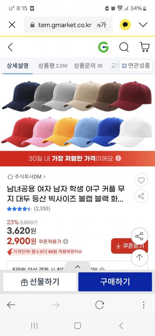 [G마켓] 핫딜! 남녀공용 대두 볼캡 야구 모자 (2,900원/무료배)