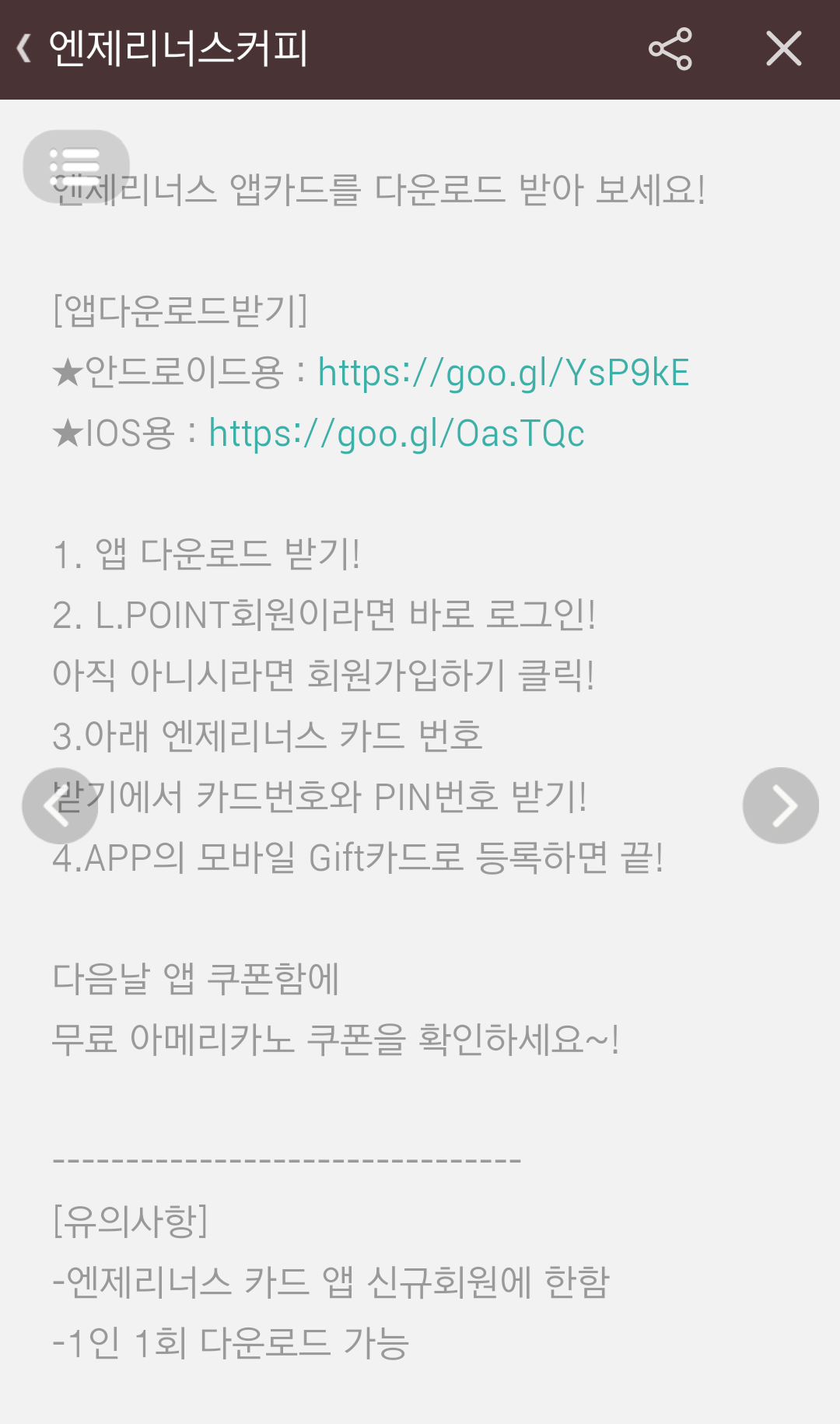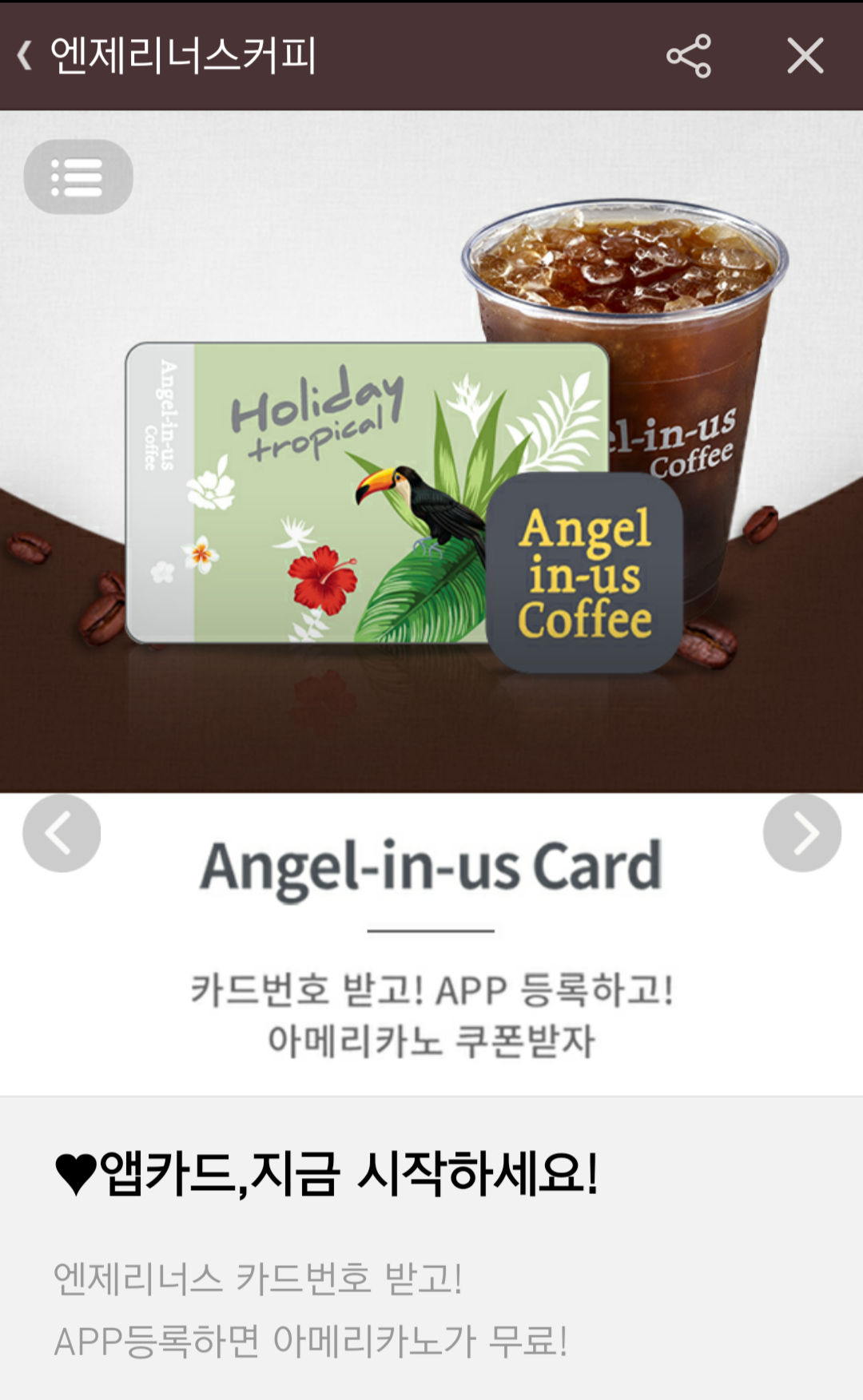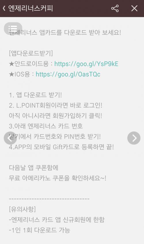 그리고 엔제리너스App 신규회원의 경우, 모바일카드를 발급받아 App에 등록하면 아메리카노 무료쿠폰도 증정하네요. 무료쿠폰은 등록 다음날 쿠폰함에 들어옵니다.