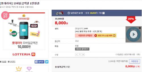 [11번가] 롯데리아 모바일금액권 1만원 (8,000/0)(3,100/0)
