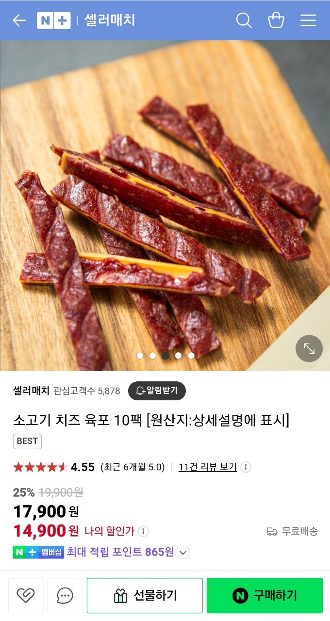 [네이버] 소고기 육포 10팩 or 치즈 육포 10팩 (14,900원/무배)