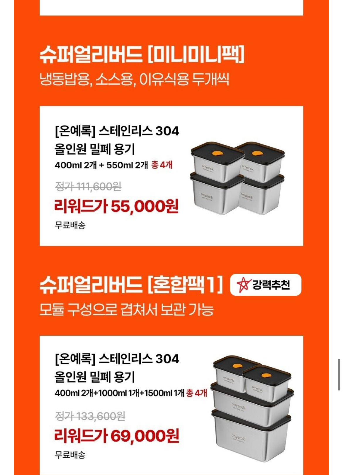 [와디즈] 스테인리스 304 올인원 밀폐용기 450ml+550ml (28,000원/무배) > 국내핫딜