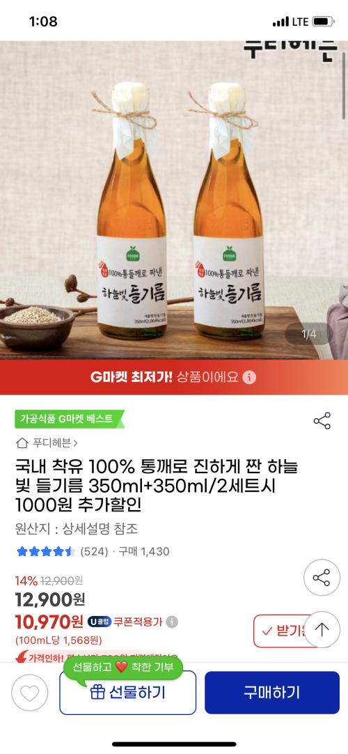 [옥션] 국내 착유 100% 통깨로 진하게 짠 하늘빛 들기름 350ml+350ml (10970원/무배)