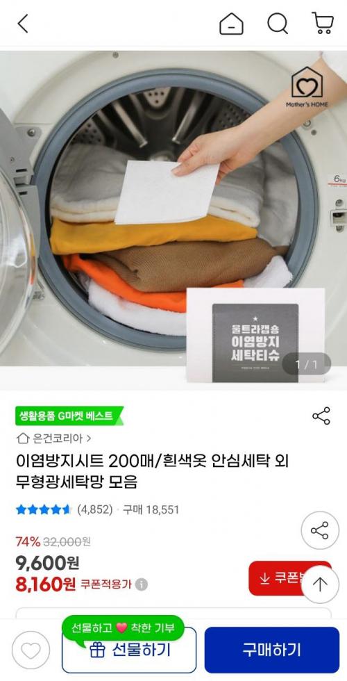 흰색옷 이염방지시트입니다 색깔옷 빨래할때 같이넣으면