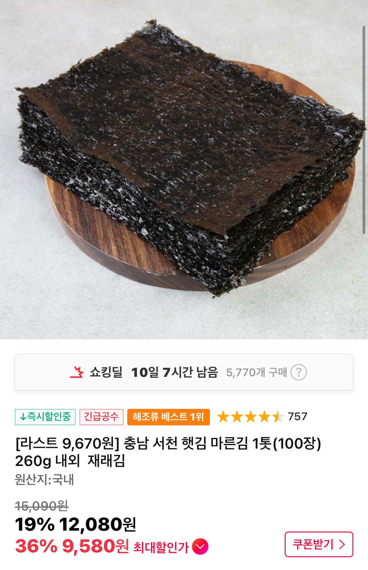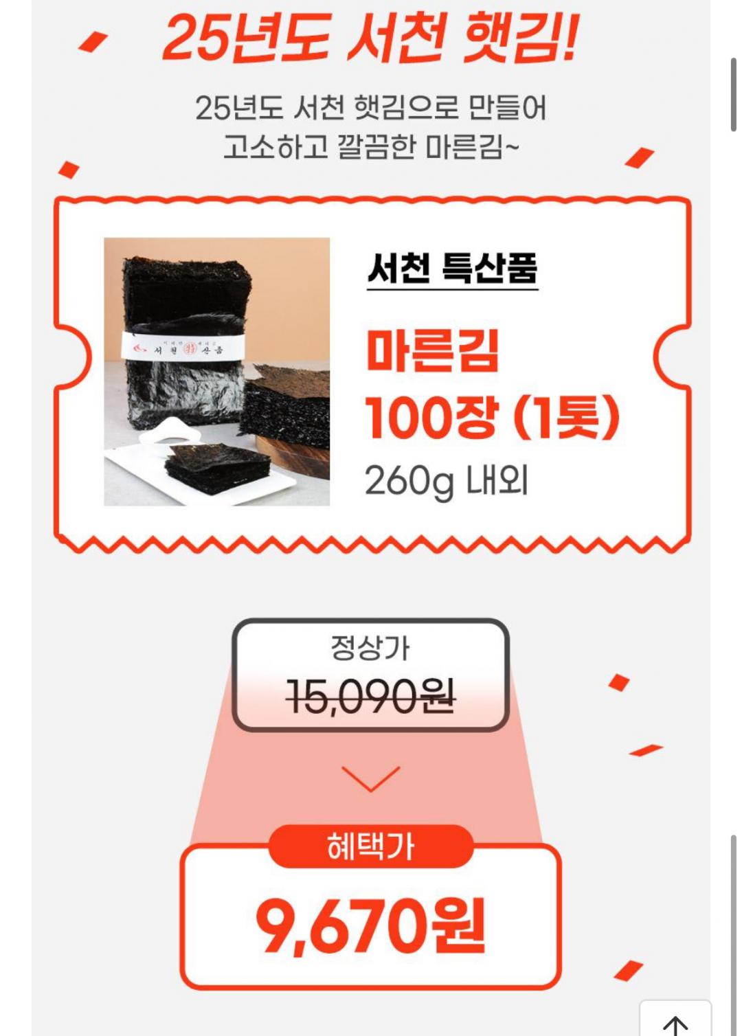 [11번가] 충남 서천 햇김 마른김 1톳(100장) 260g 내외 재래김 (9,670원/무배) > 국내핫딜