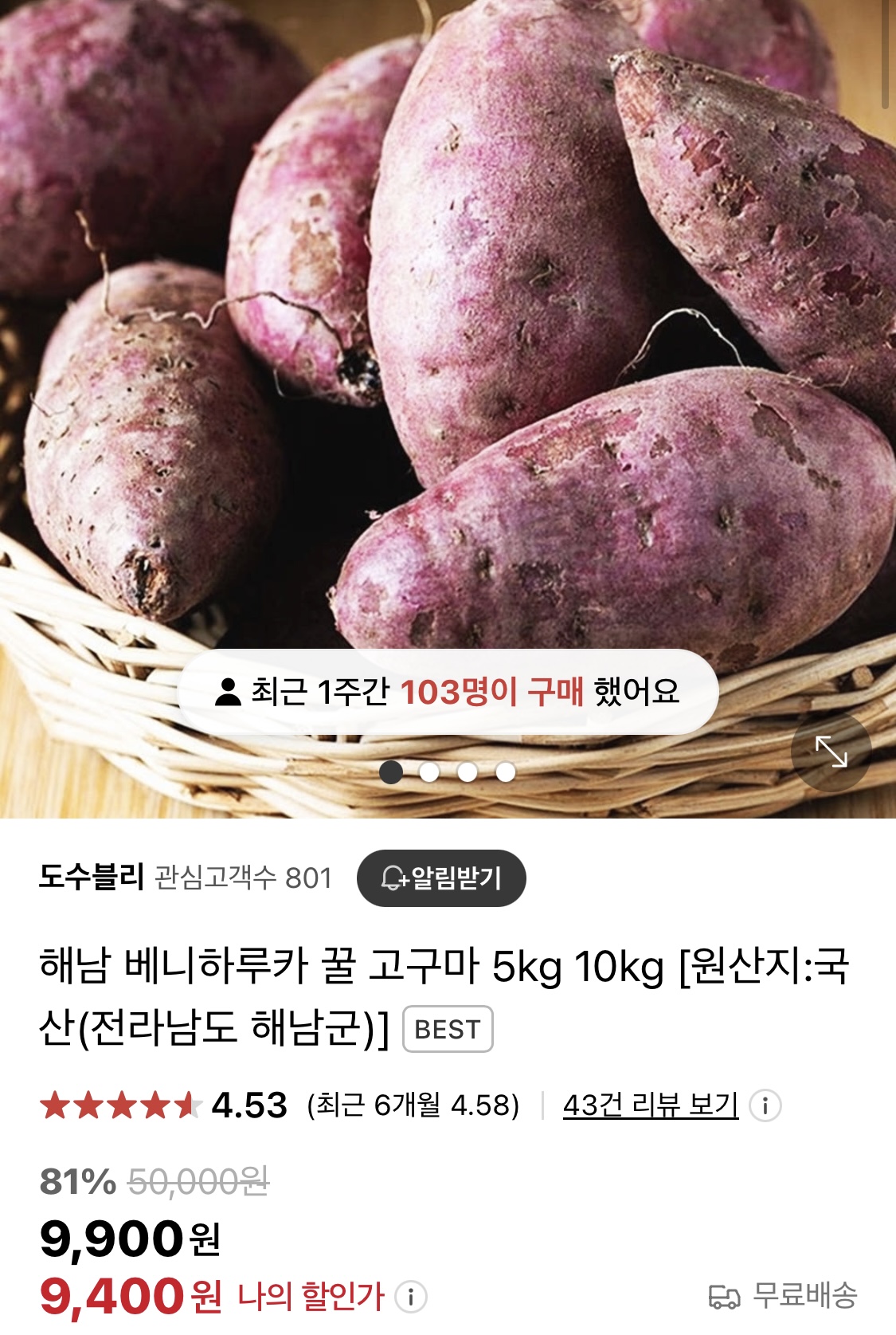 [네이버] 해남 베니하루카 꿀고구마 중상3kg (9,400원/무배) > 국내핫딜