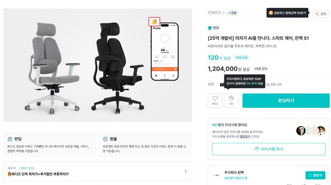 [와디즈] 린백 S1 스마트체어 (199,000원/무료)