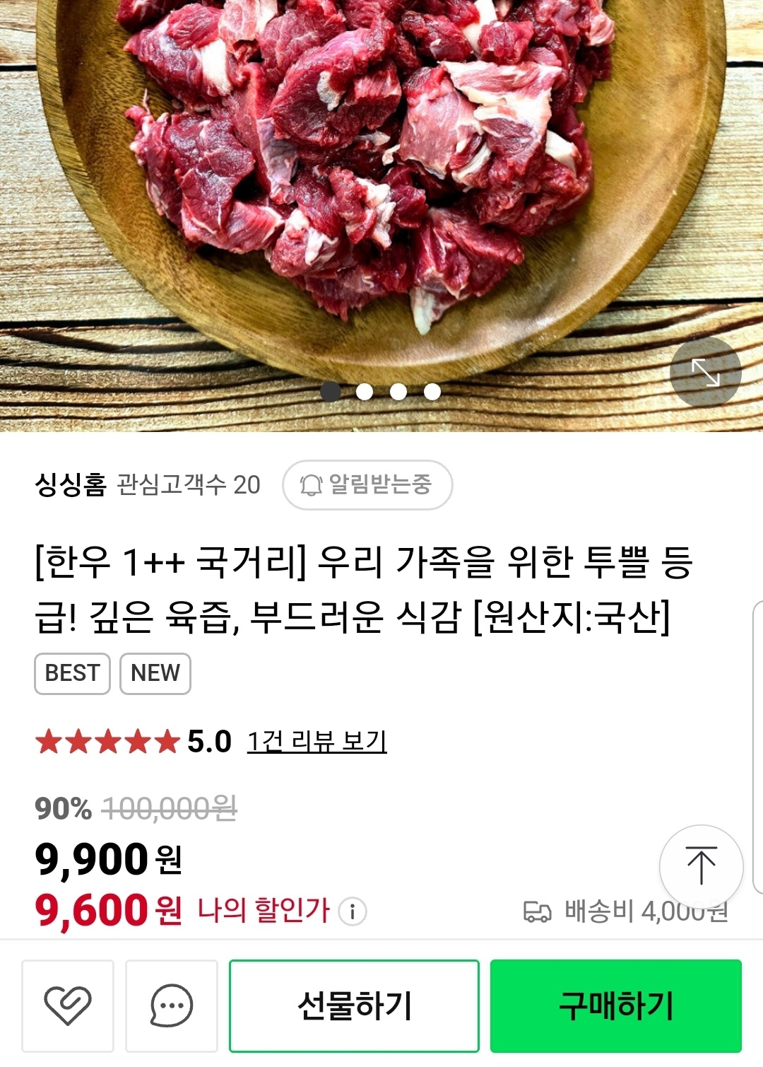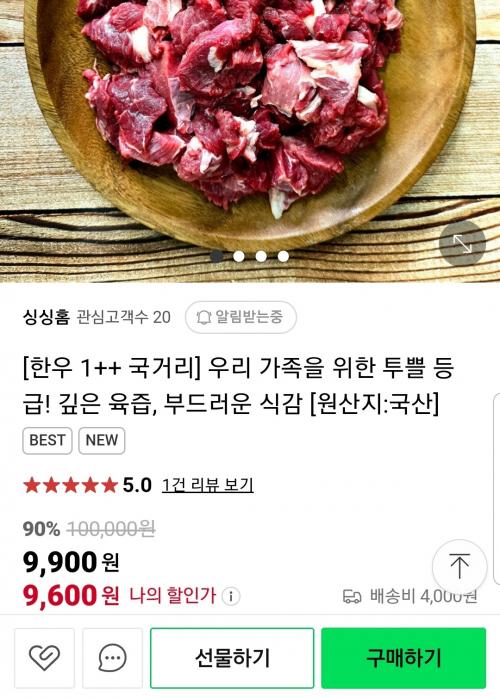 한우 1++ 등급 300g이 9,900원입니다