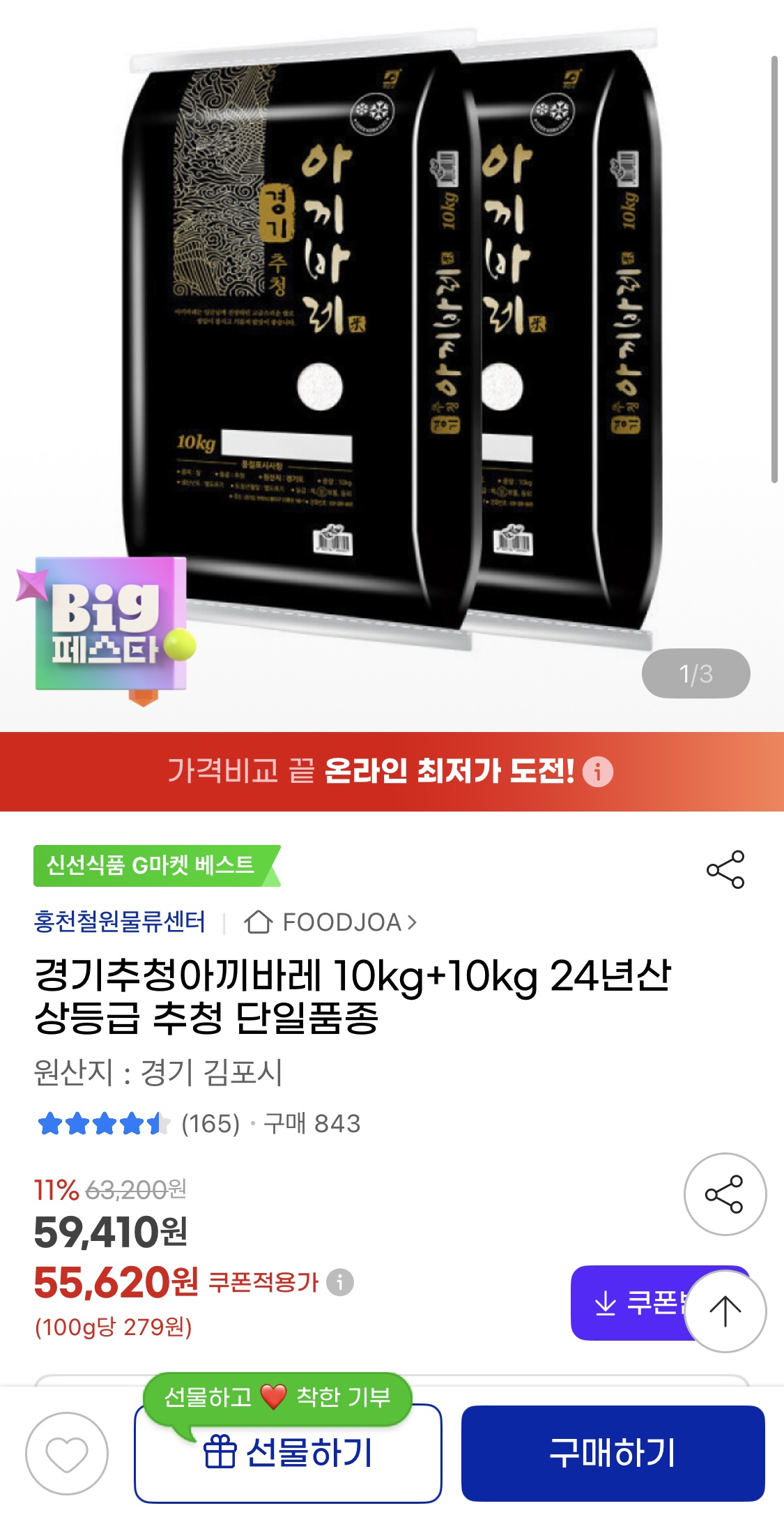 [지마켓] 경기 추청 아끼바레 20kg 상등급 단일품종 (52,780원/무료)