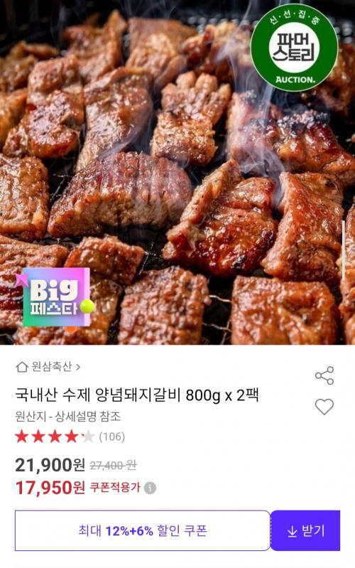 [옥션] 국내산 수제 양념돼지갈비 800g x 2 (17,950원/무료)