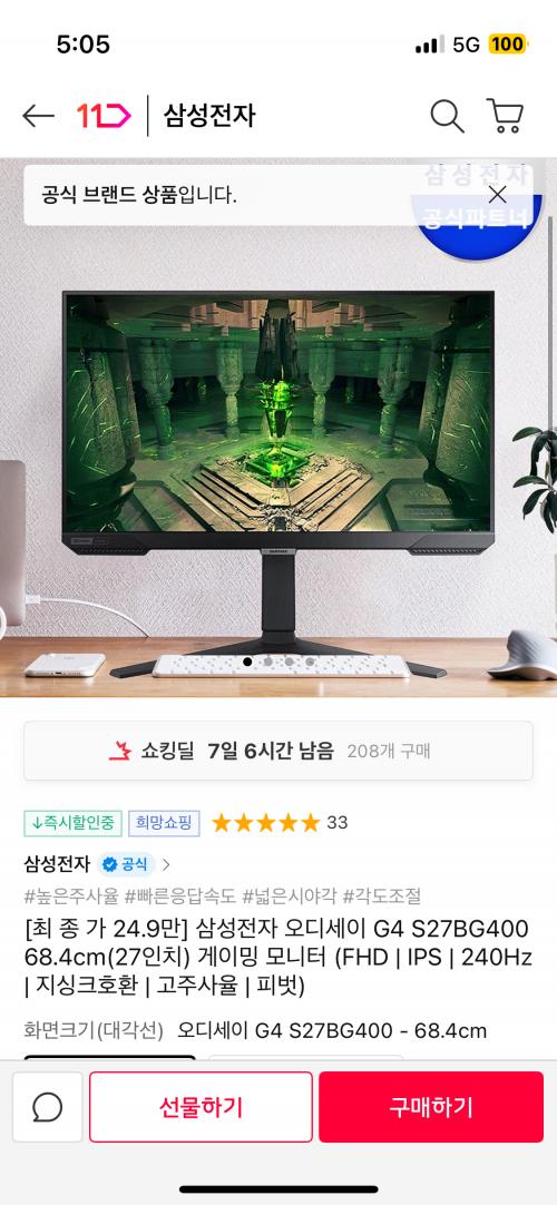[11번가] 삼성전자 오디세이 G4 S27BG400 68.4cm(27인치) 게이밍 모니터(249,520원)