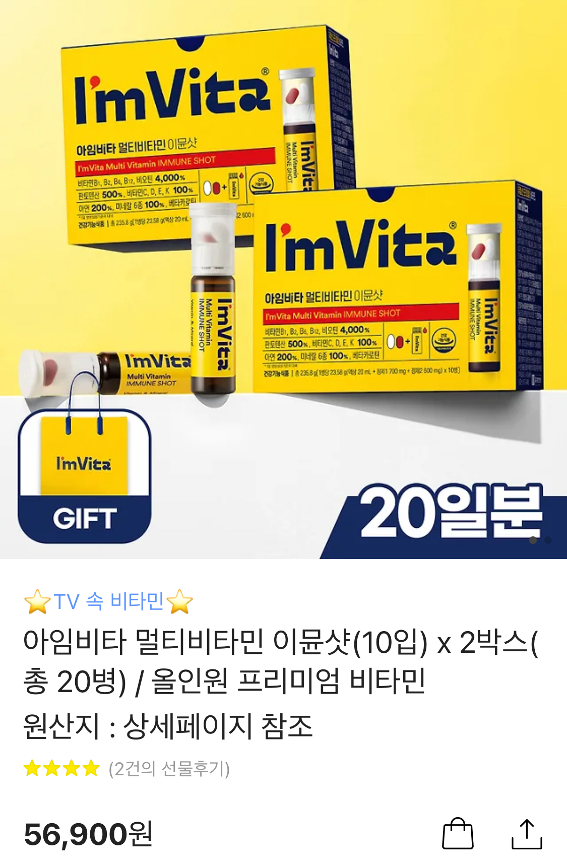 [카카오선물] 아임비타 멀티비타민 이뮨샷 2박스 카카오페이 할인 (56,900원/무배)
