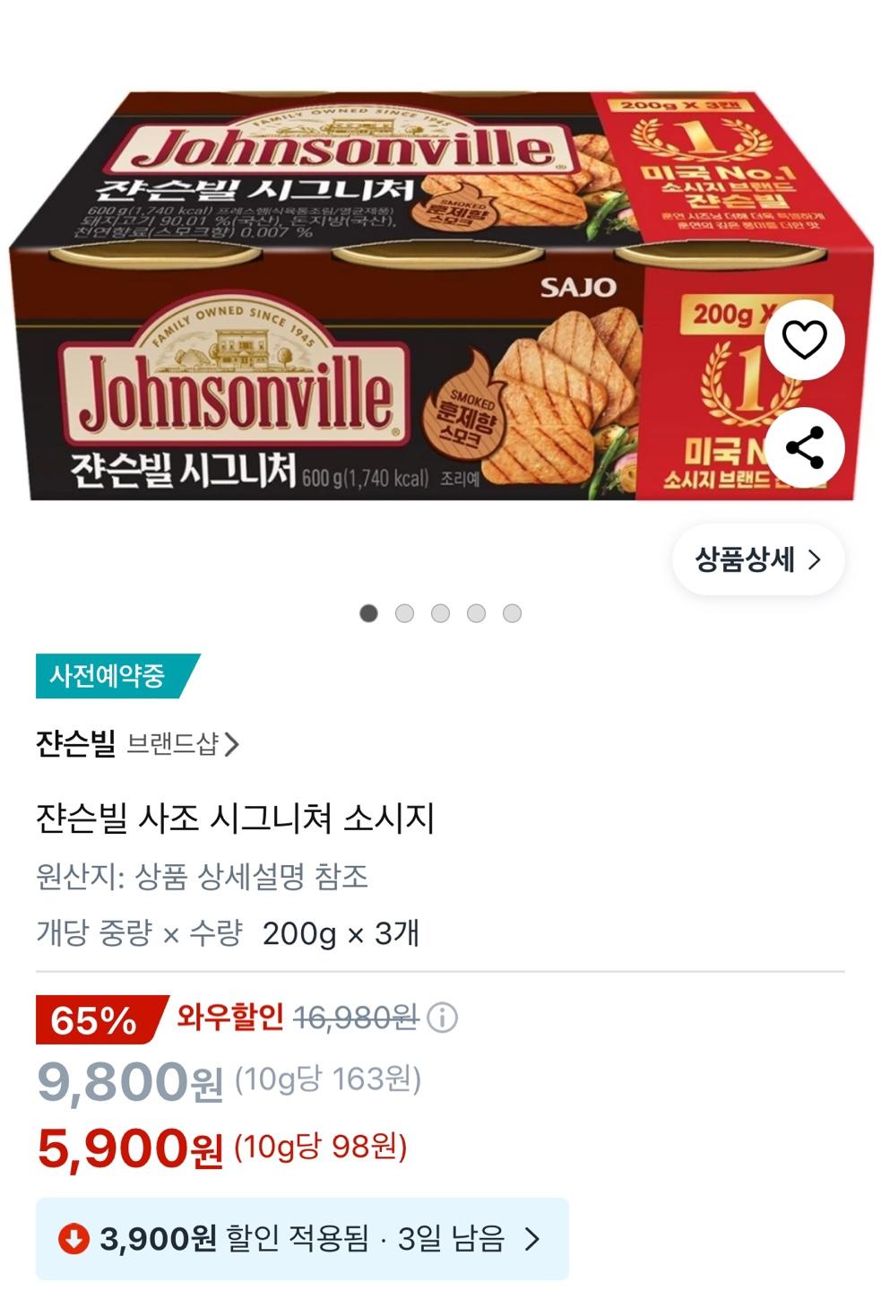 [쿠팡] 쟌슨빌 시그니쳐 캔햄 200g x 3캔 (5,900원/무료)
