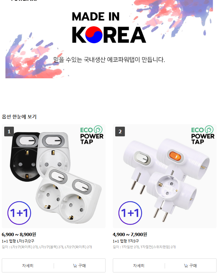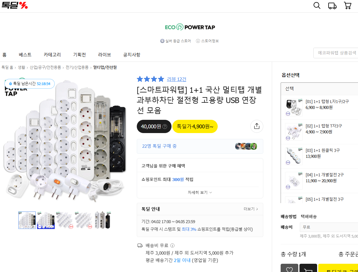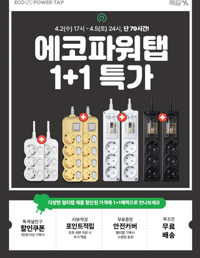 [카톡딜] 1+1 국산 멀티탭 과부하차단 절전형 (4,900원/무료)