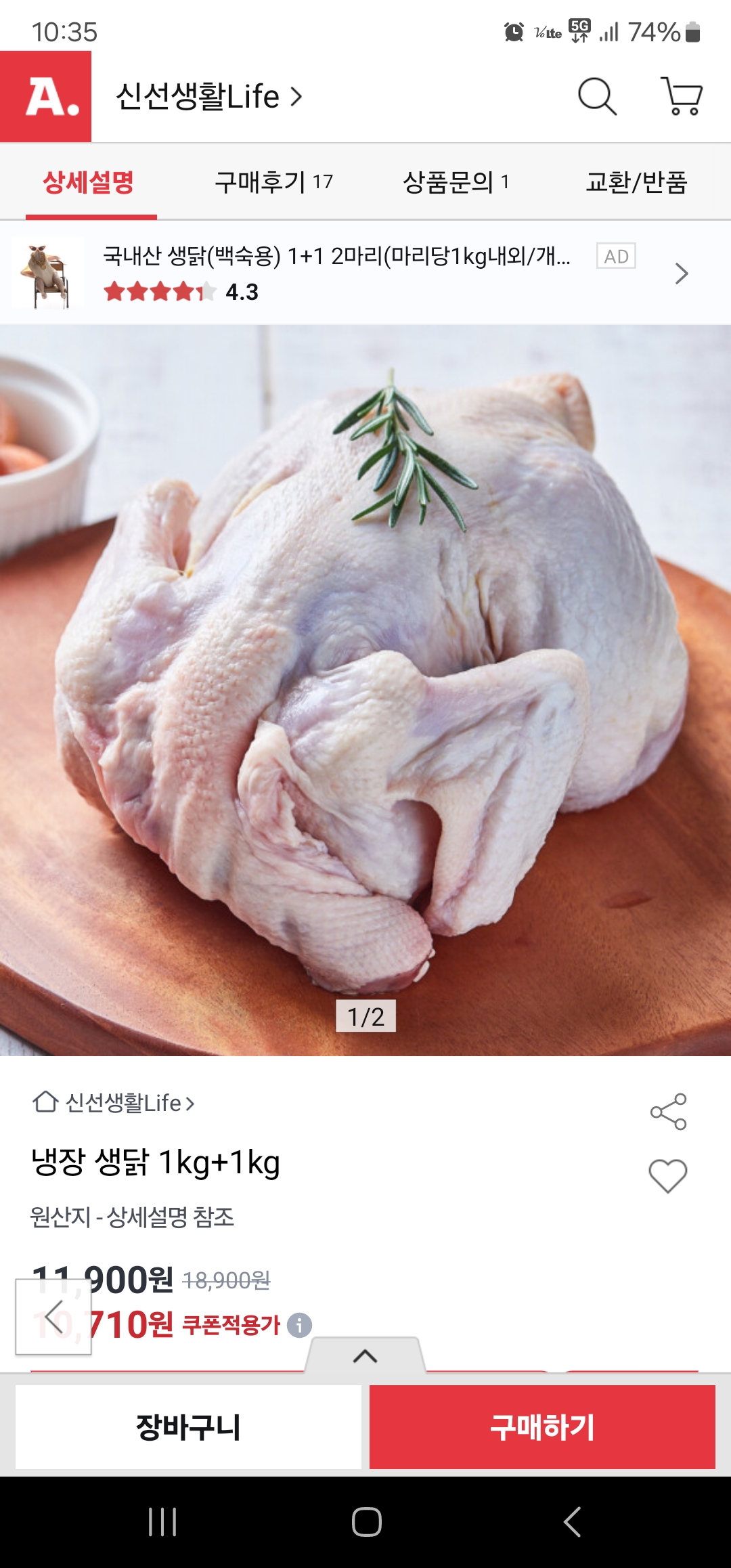 [옥션] 국내산 냉장생닭 1kg+1kg 10,710원 무배