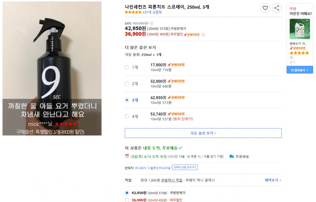[쿠팡] 나인세컨즈 피톤치드 스프레이, 250ml, 3개 (36900/무료) > 국내핫딜