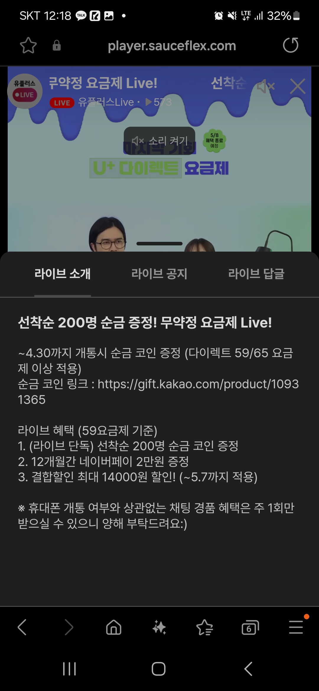 유플러스 다이렉트59 요금제 라이브 혜택 좋네요~