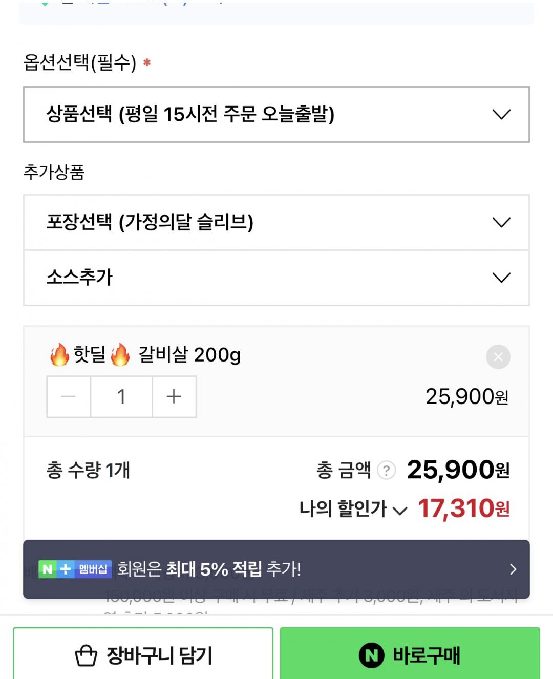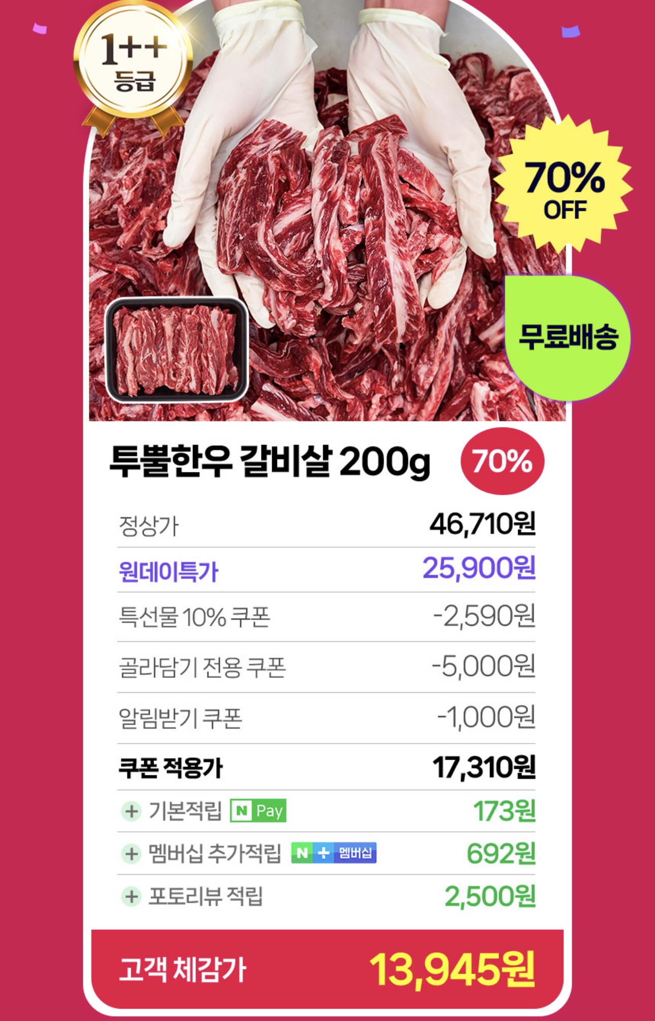 투뿔 한우 갈비살 200g 쿠폰 적용하시면 17,310원 나오고