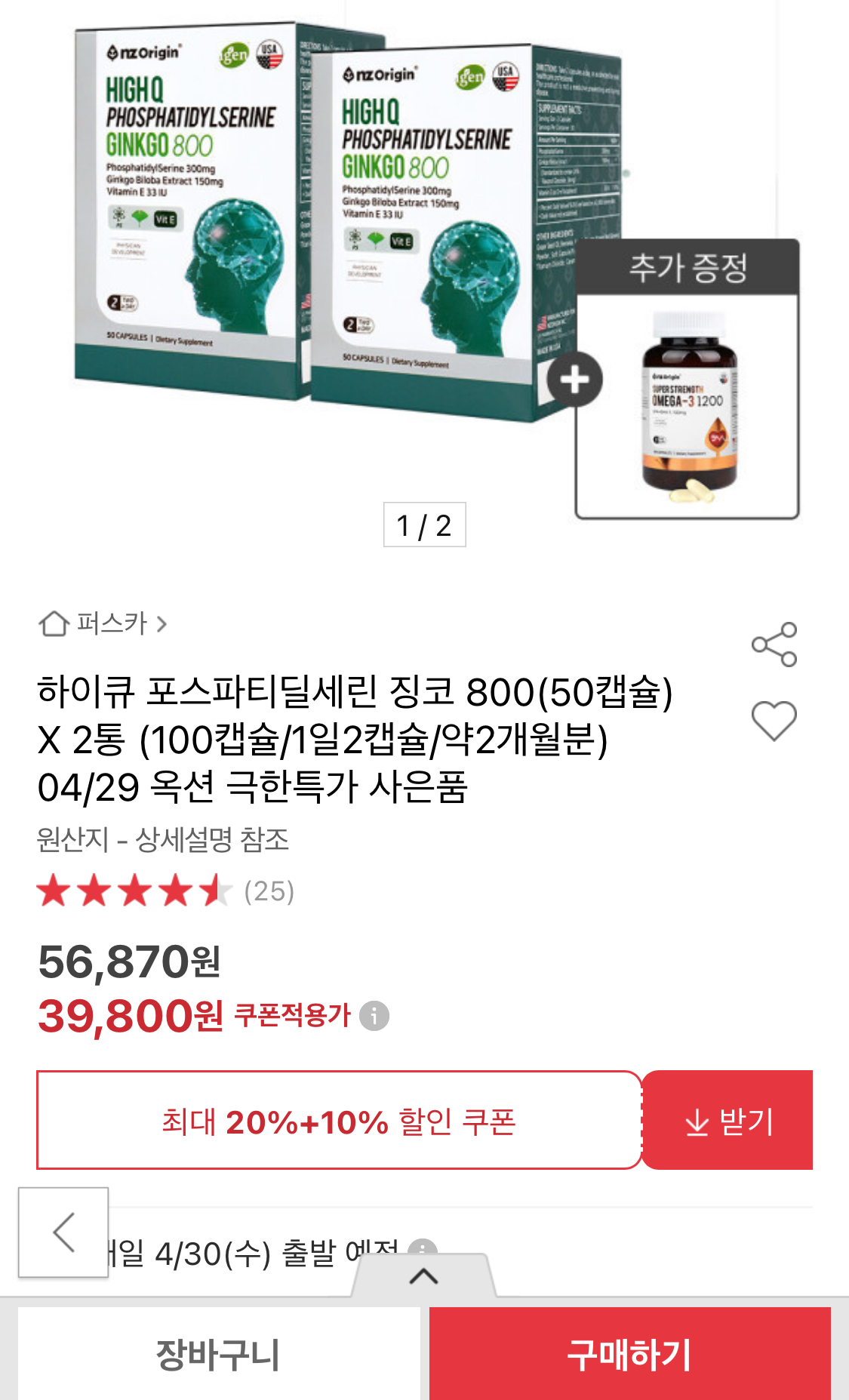 [옥션] 하이큐 포스파티딜세린 징코 50캡슐 2통(총100캡슐)(39,800원/무료)