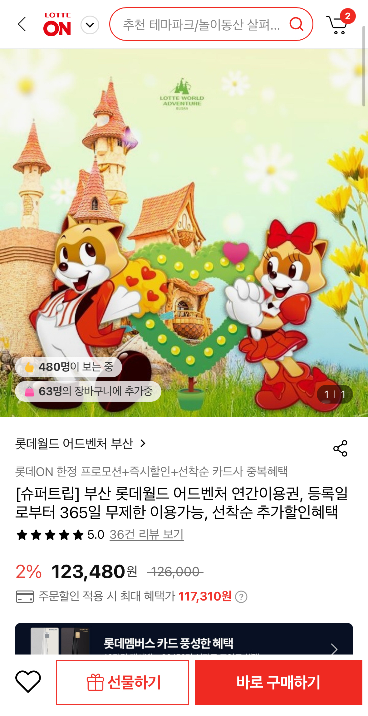 [롯데온] 부산 롯데월드 어드벤처 연간이용권 (117,310원/무료)