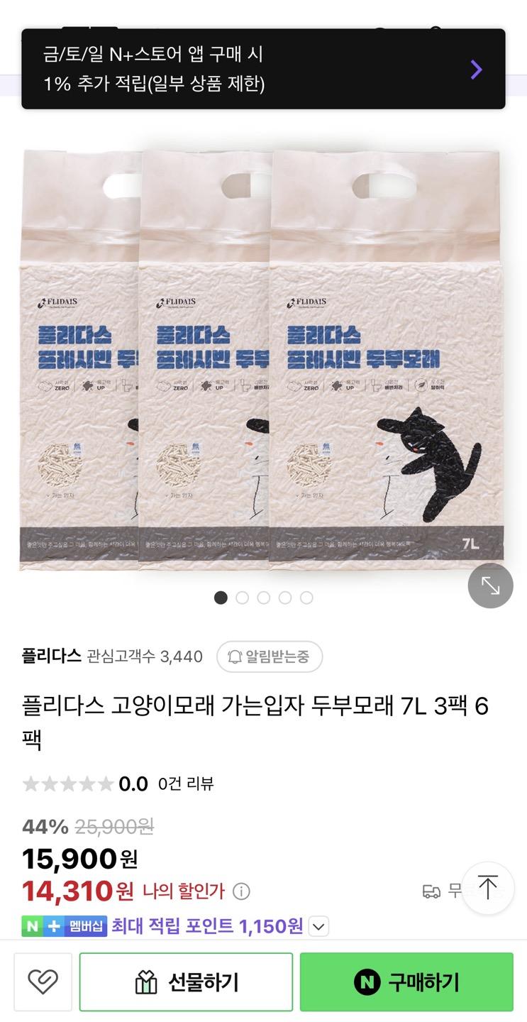 [네이버] 고양이모래 가는입자 두부모래 2.8kg 3팩 총 8.4kg (14,310원/무배)