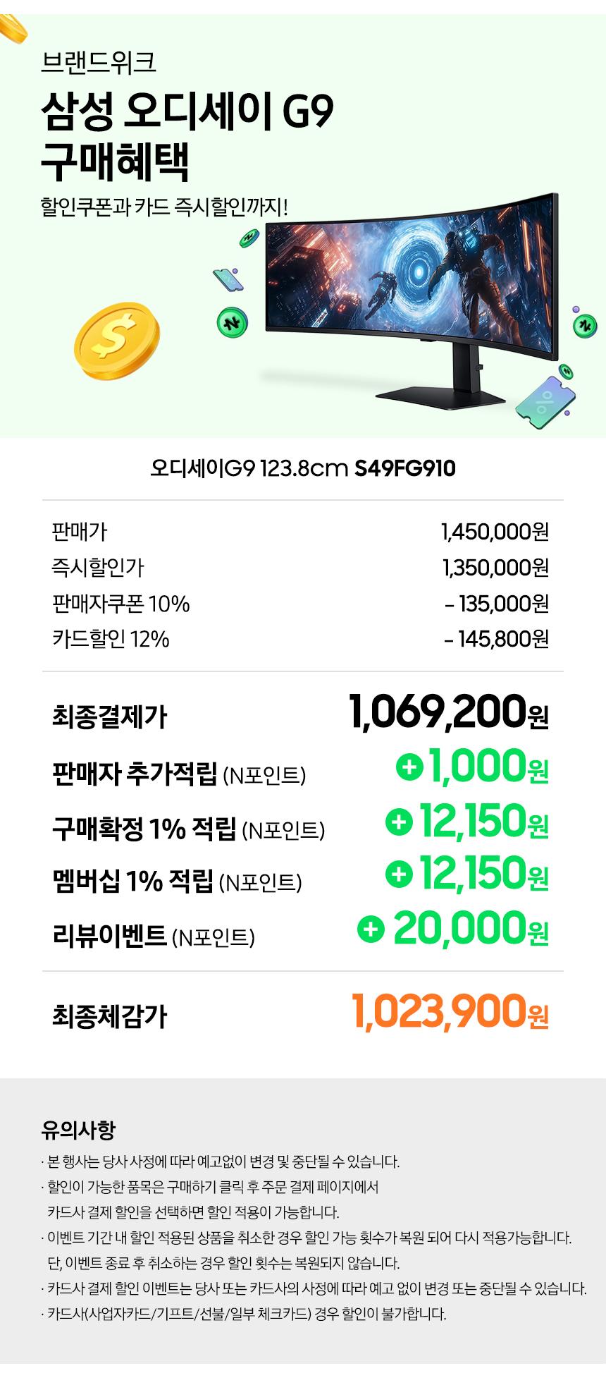 [네이버] 삼성 오디세이 G9 S49FG910 123.8cm(49인치) 울트라 와이드 게이밍 모니터(1,023,900원/무료)
