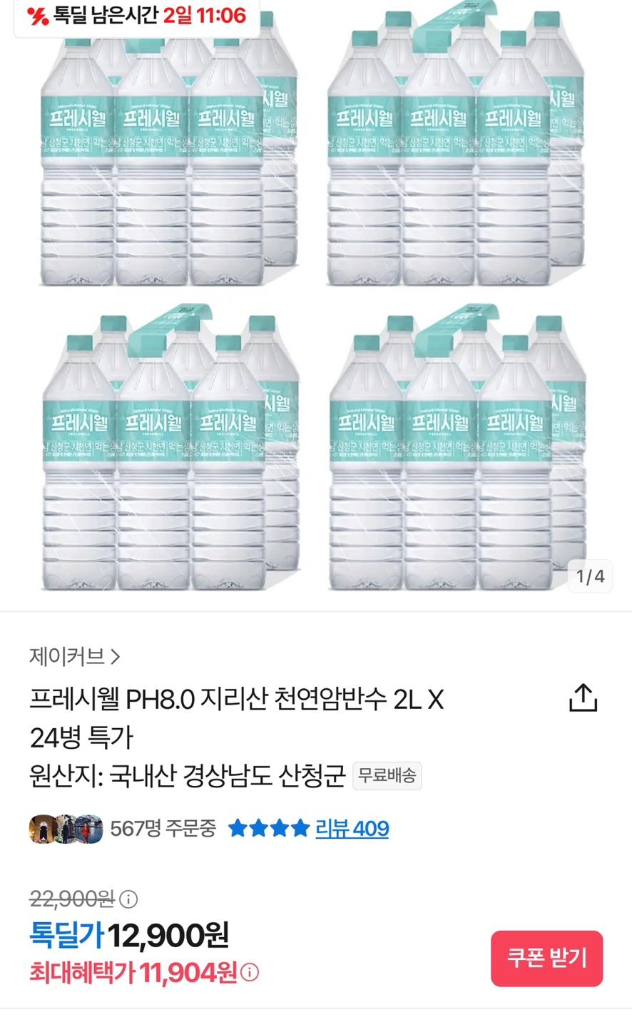 [톡딜] 지리산 천염암반수 생수 2L x 24병 (11,904원/무료)