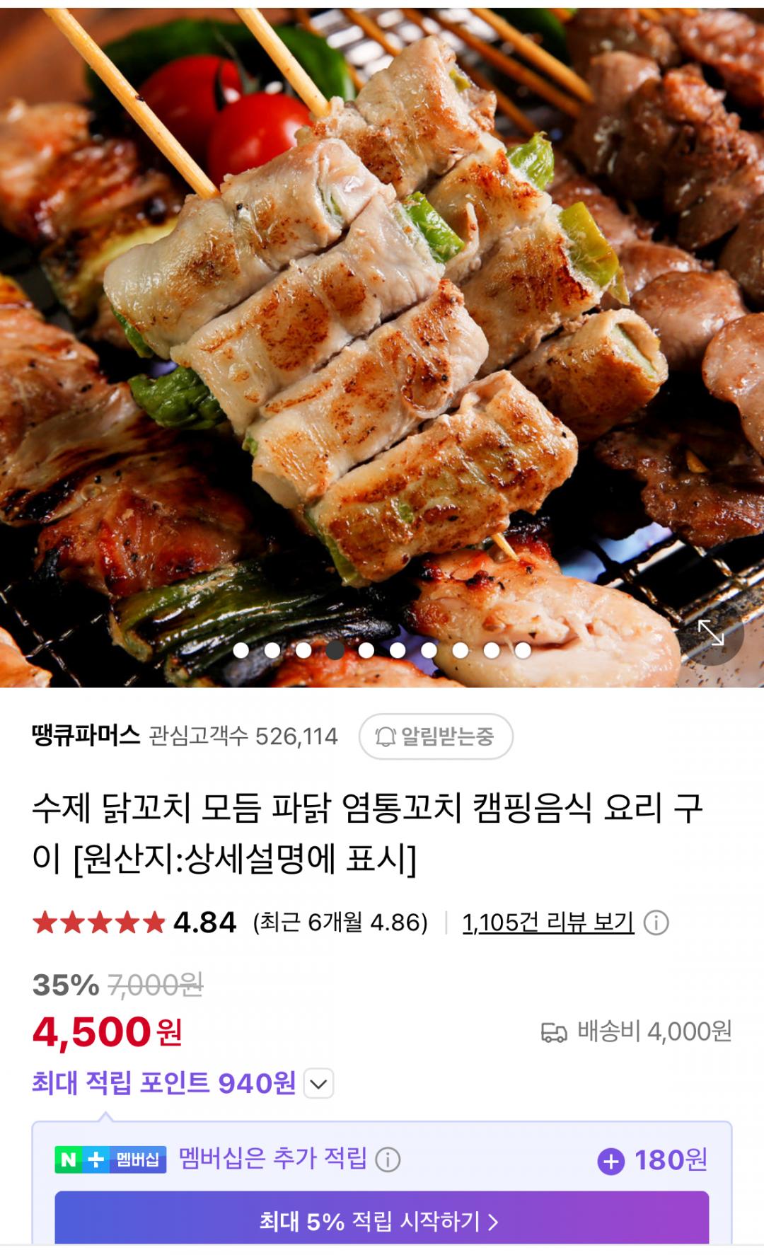 [네이버] 수제 왕 닭꼬치 5개 (4,500원/유배)