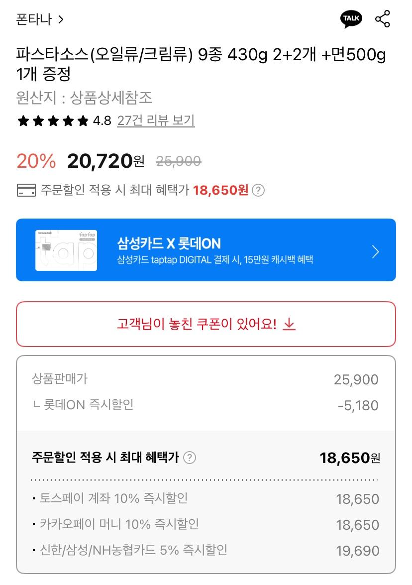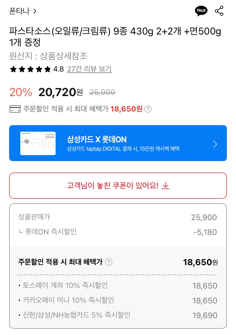 [롯데온] 폰타나 알리오올리오 2개+갈릭 봉골레 2개+면 증정 (18,650원/무료) > 국내핫딜