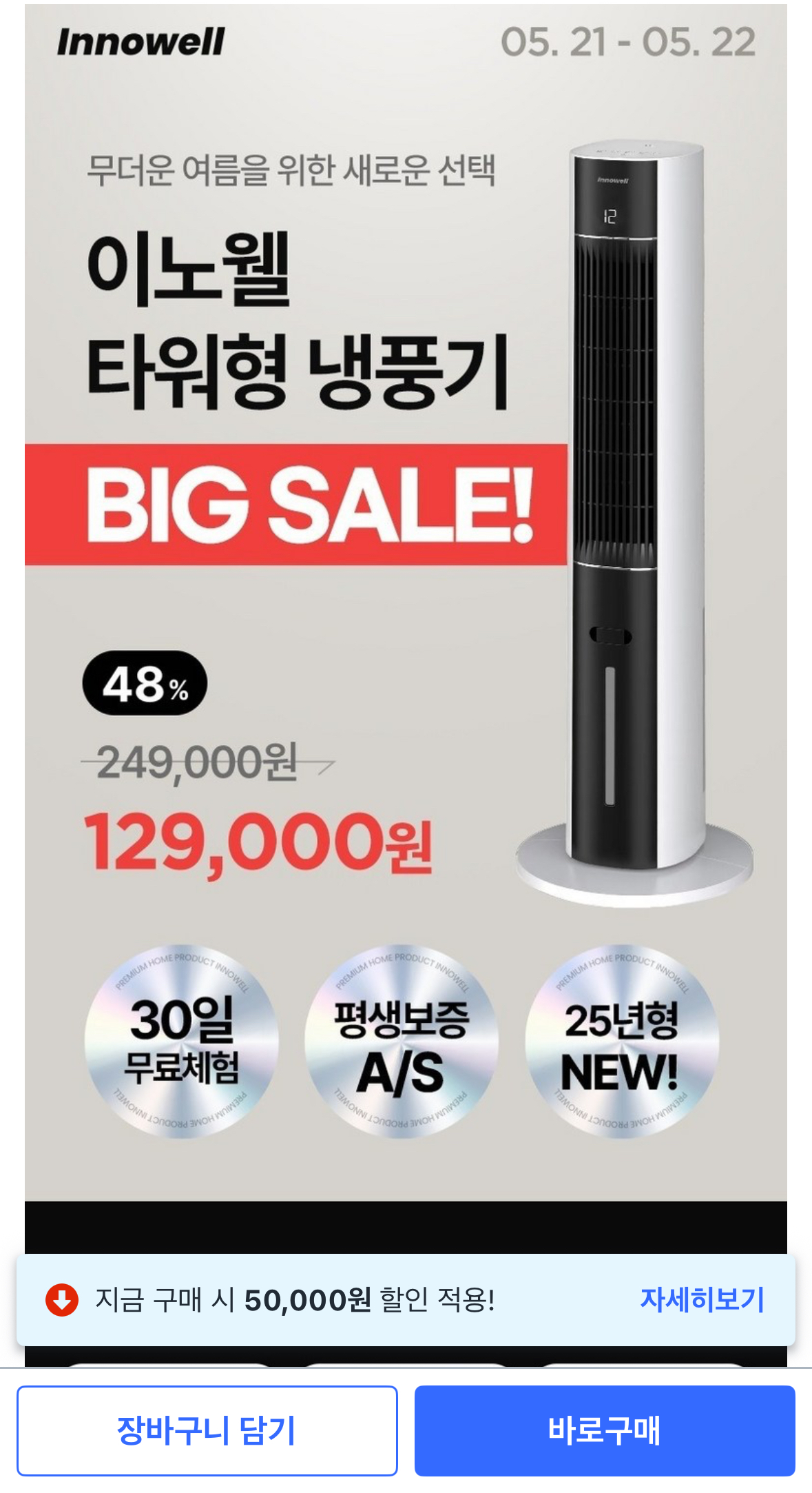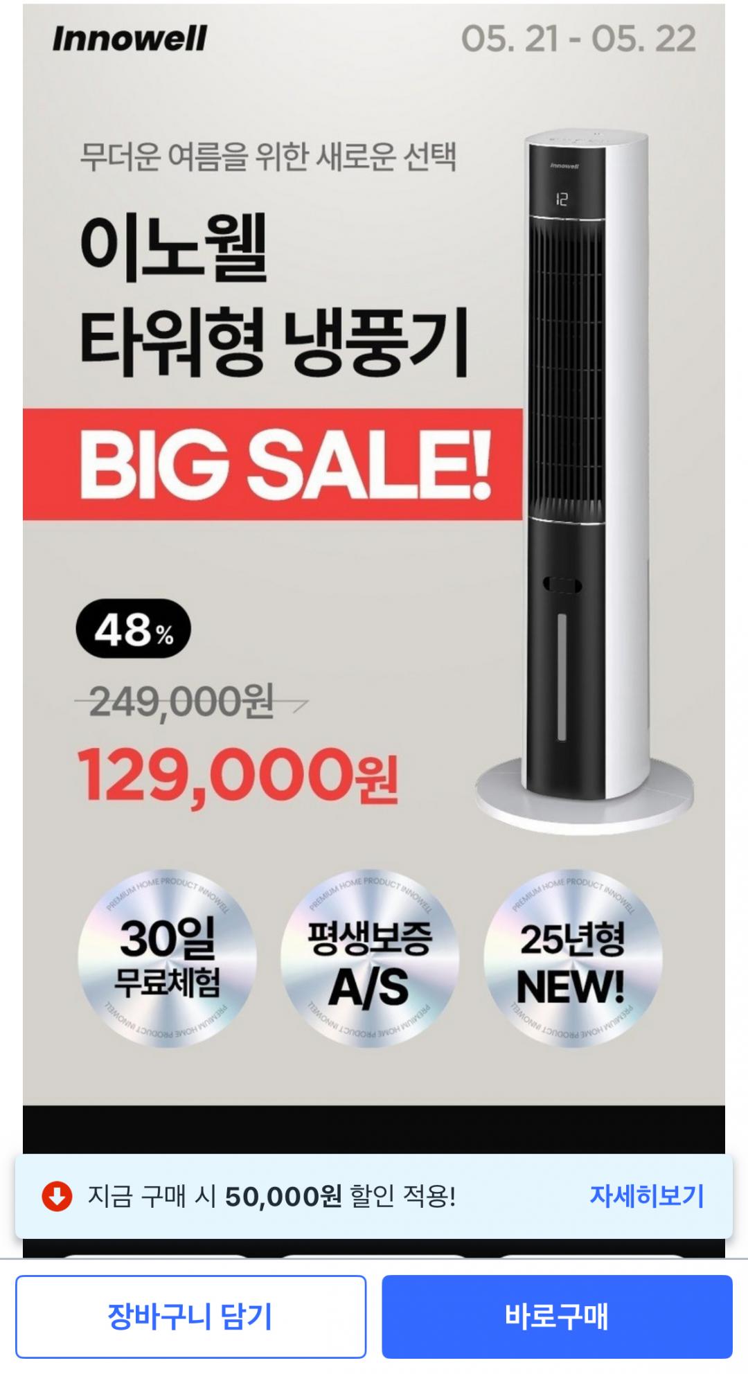 이노웰 타워형 냉풍기 할인 행사 진행 중입니다
