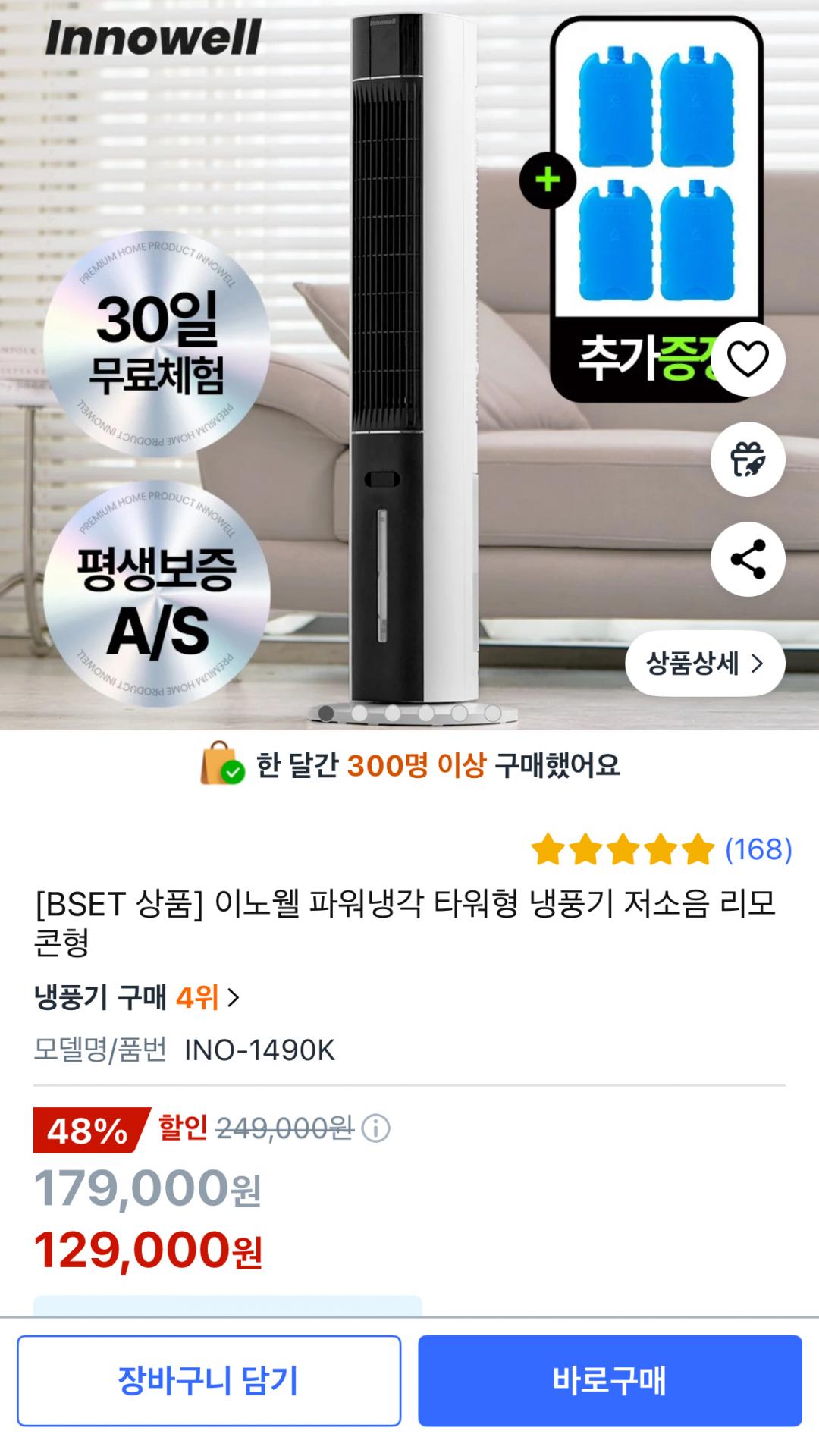 [쿠팡] 이노웰 파워냉각 파워형 냉풍기 저소음 리모콘형 (129,000원/무료배송)