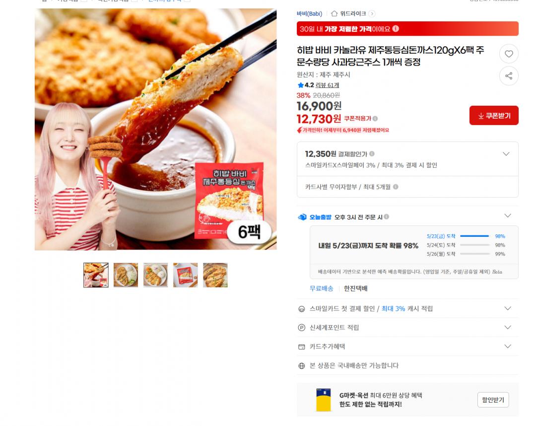 [g마켓] 히밥 바비 카놀라유 제주통등심돈까스120g*6팩 (12730/무료) > 국내핫딜