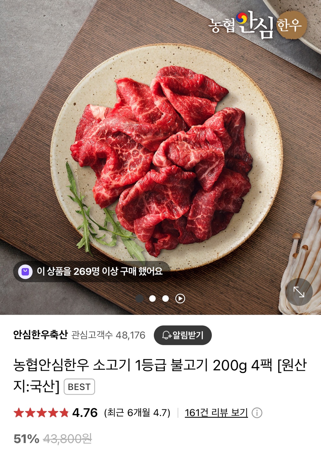 농협 안심한우 불고기 200g x 4팩 18920원 1팩당 4천원대 가격 좋아요