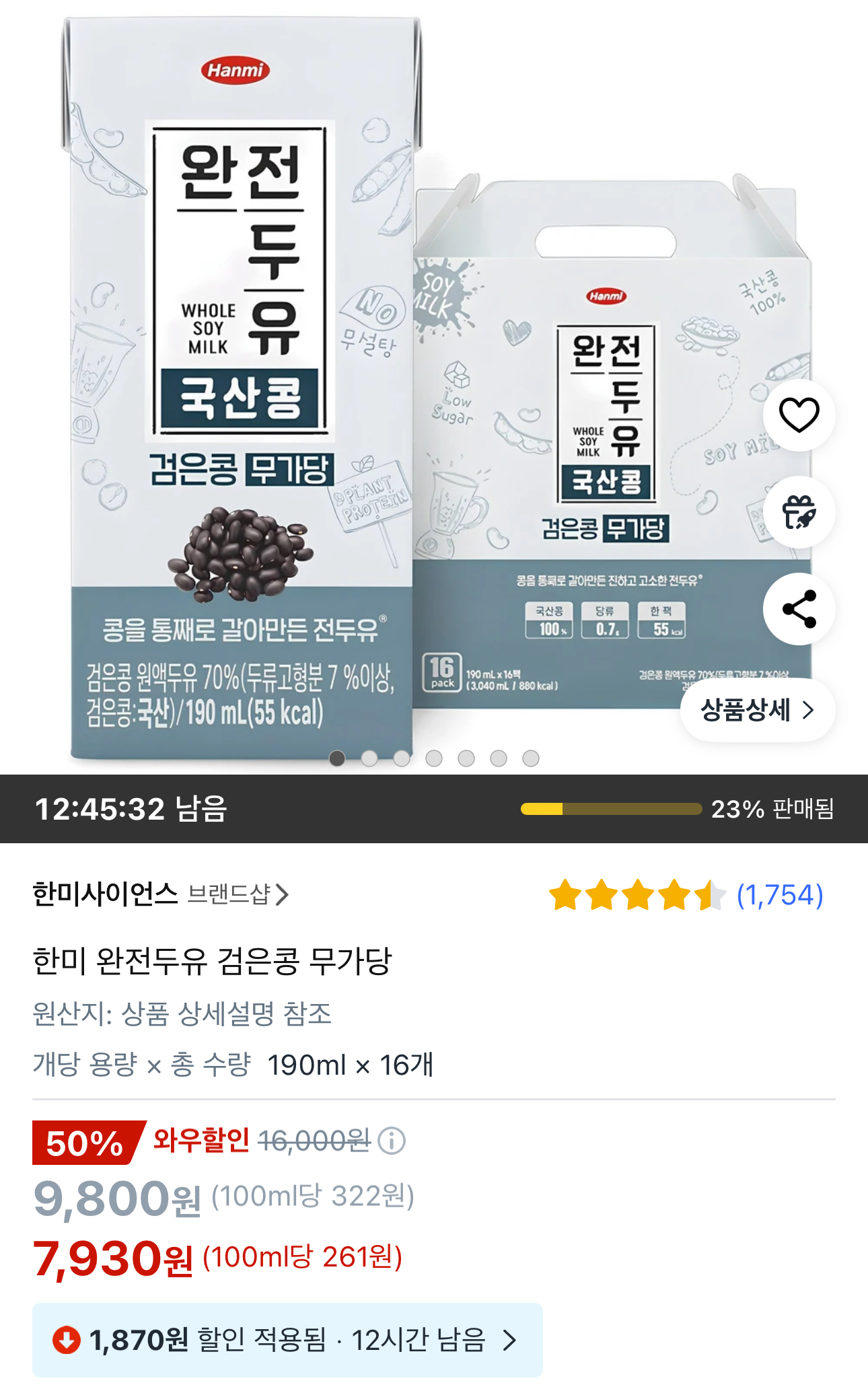 [쿠팡] 한미 완전두유 검은콩 무가당 190ml 16 (7,930원/무배) > 국내핫딜