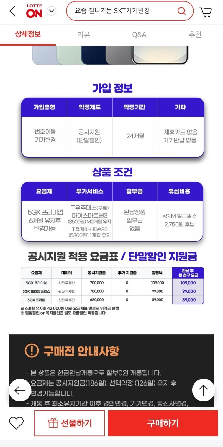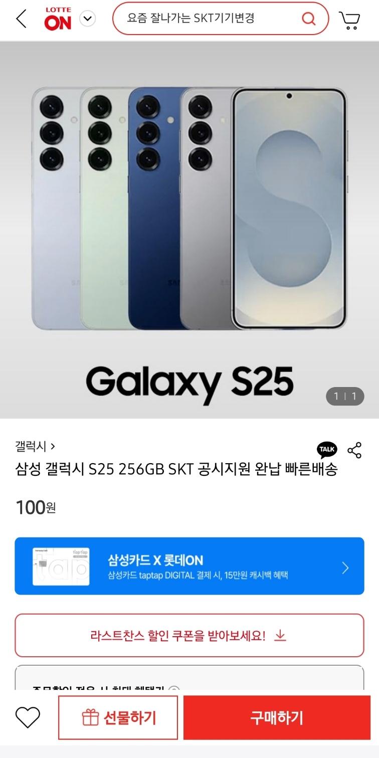 [롯데온] 삼성 갤럭시 S25 공시지원 기기변경 (100원/무료)