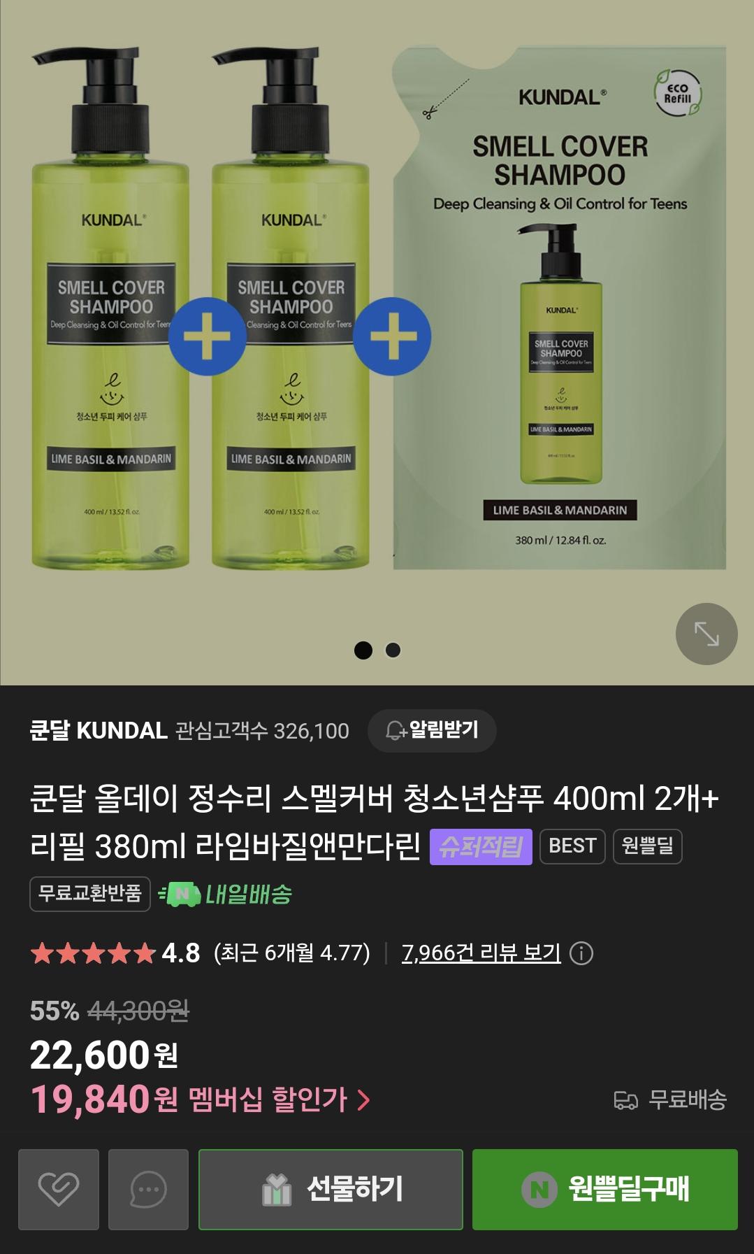 [네이버] 쿤달 올데이 정수리 스멜커버 청소년샴푸 400ml x 2개+리필 380ml (19,840원/무료)