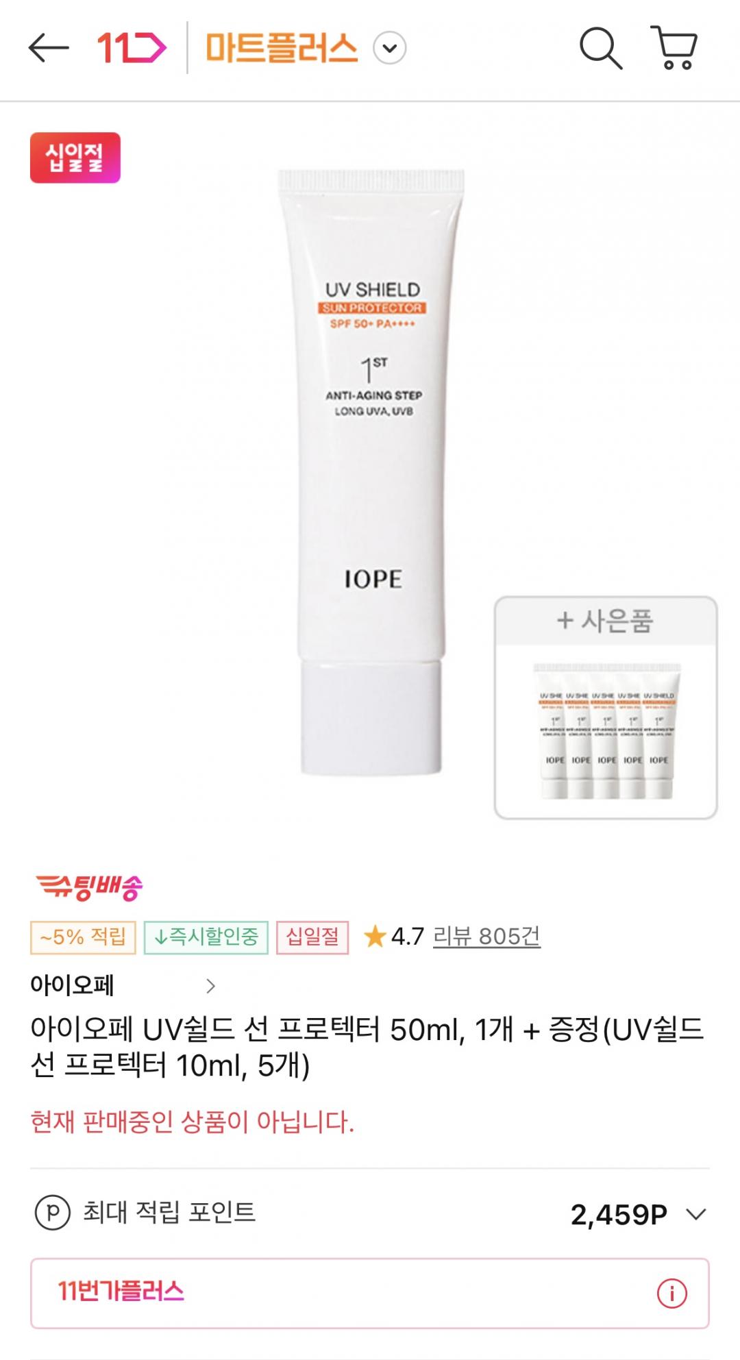 [11번가]10분러시 아이오페 UV쉴드 선 프로텍터 50ml+증정 (22,900원/무료) > 국내핫딜