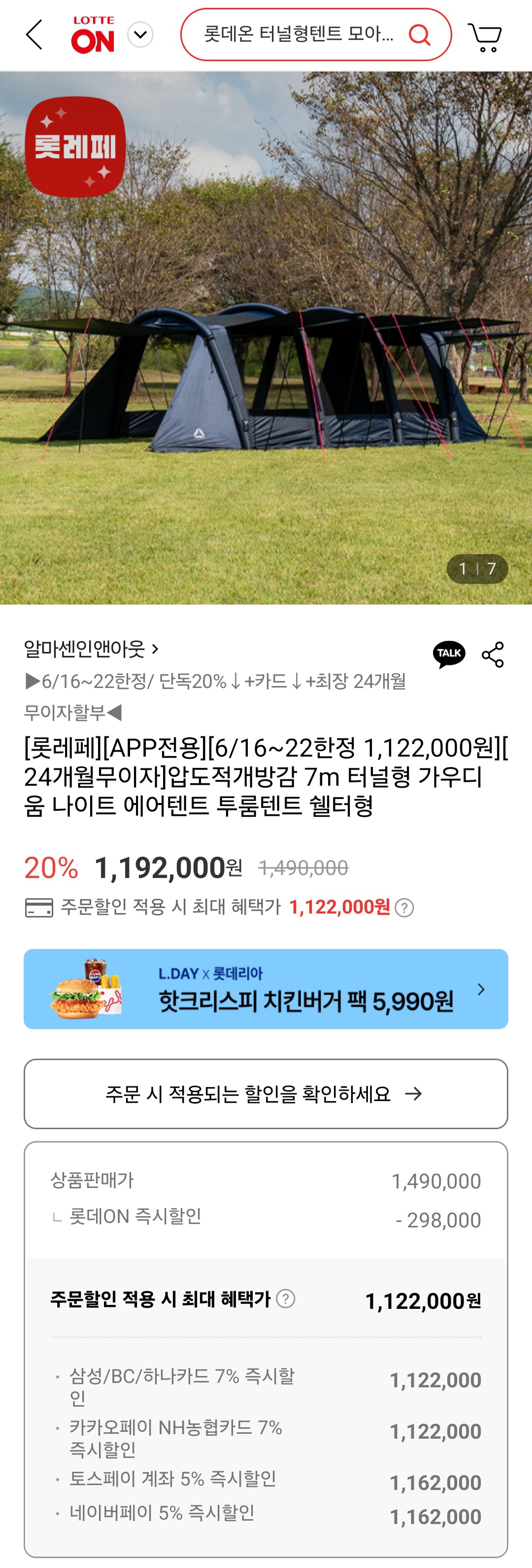 [롯데온] 7m 터널형 가우디움 나이트 에어텐트 투룸텐트 쉘터형 (1,122,000원/무배) > 국내핫딜