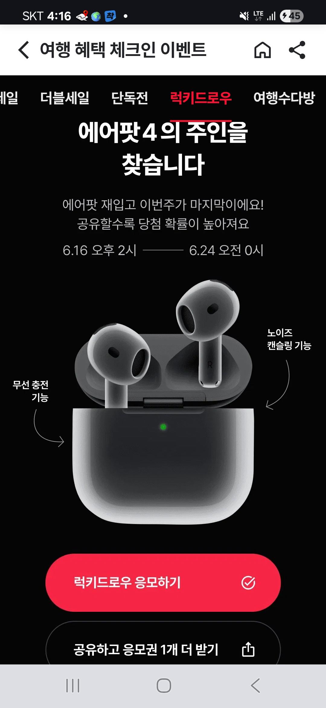 럭키드로우 이벤트도 로그인만 하면 매일 응모되고 에어팟 추첨이니 응모해 보시고요~