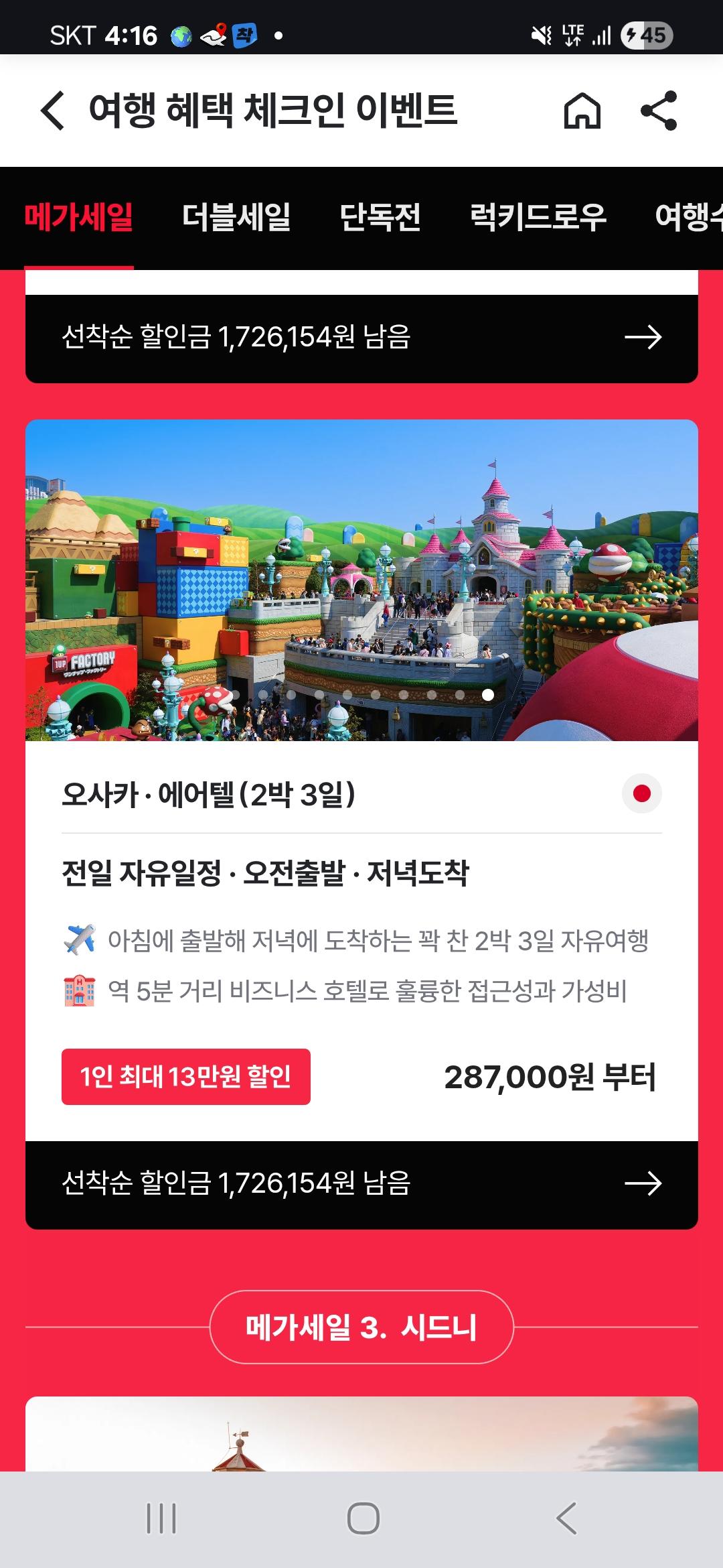 오사카 에어텔은 2박3일 287,000원부터 있어요.