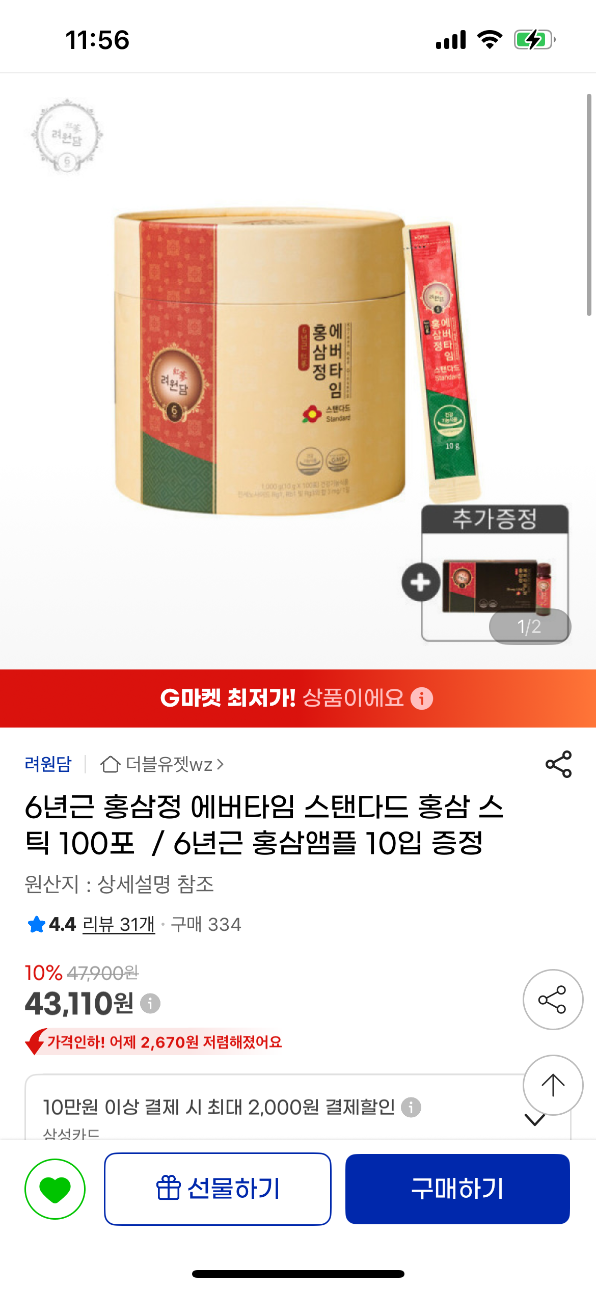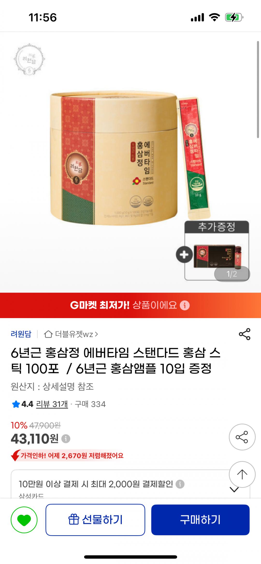 홍삼정 에버타임 홍삼 스틱 100포+ 홍삼앰플 10입 증정 상품 43110원 무료배송입니다!