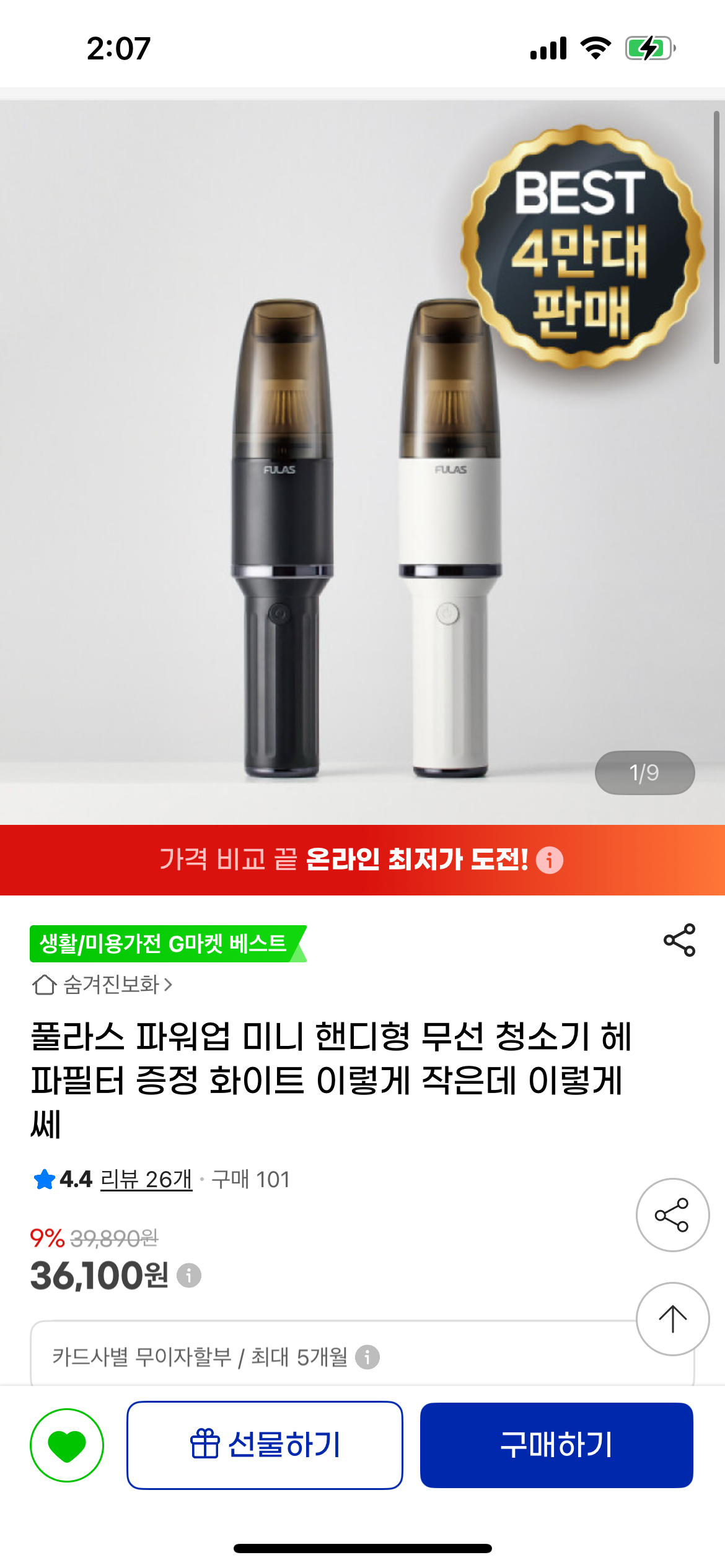 [지마켓] 파워업 미니 핸디형 무선 청소기 (36,100원/무료) > 국내핫딜